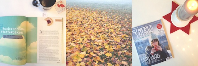 Die Zeitschrift Flow gibt es jetzt auch auf deutsch. Das finde ich super, denn ich mag sie sehr, konnte die niederländische Ausgabe bisher aber nicht lesen, sondern nur Bildchen gucken. Ich mag den Mix aus schönen und gut geschriebenen Texten und inspirierenden Fotos! // Herbstlicher Blätterteppich an frostiger Winterwiese. // Und dann kam die nächste Lieblinsgzeitschrift ins Haus geflattert. Ich werde auf Instagram übrigens immer wieder gefragt, wo ich meine Zeitschriften beziehe. The Simple Things habe ich mittlerweile als Abo bestellt. Die Flow habe ich im Globus erstanden und ansonsten frage ich beim Zeitungskiosk meines Vertrauens. Die können Zeitschriften ganz schnell bestellen.