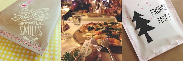 Wenn man kein hübsches Geschenkpapier zur Hand hat, wird das Päckchen einfach zugenäht! // Bloggertreffen in Köln. Erst Glühweintrinken auf dem Weihnachtsmarkt am Stadtgarten, anschl. lecker Flammkuchen in der Bar Tabac. // und weil das beim letzten Mal so hübsch aussah, habe ich gerade eben wieder ein Geschenk eingenäht. Dazu ein Bäumchen und Sterne auf das weisse Papier geklebt, Frohes Fest gewünscht und fertig. Das Buch wird heute Abend beim Wichteln verschenkt. Ich hoffe, ich treffe den Geschmack der Empfängerin.