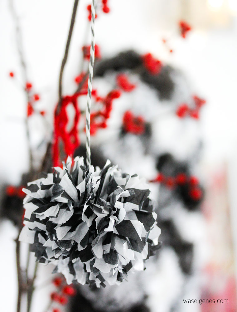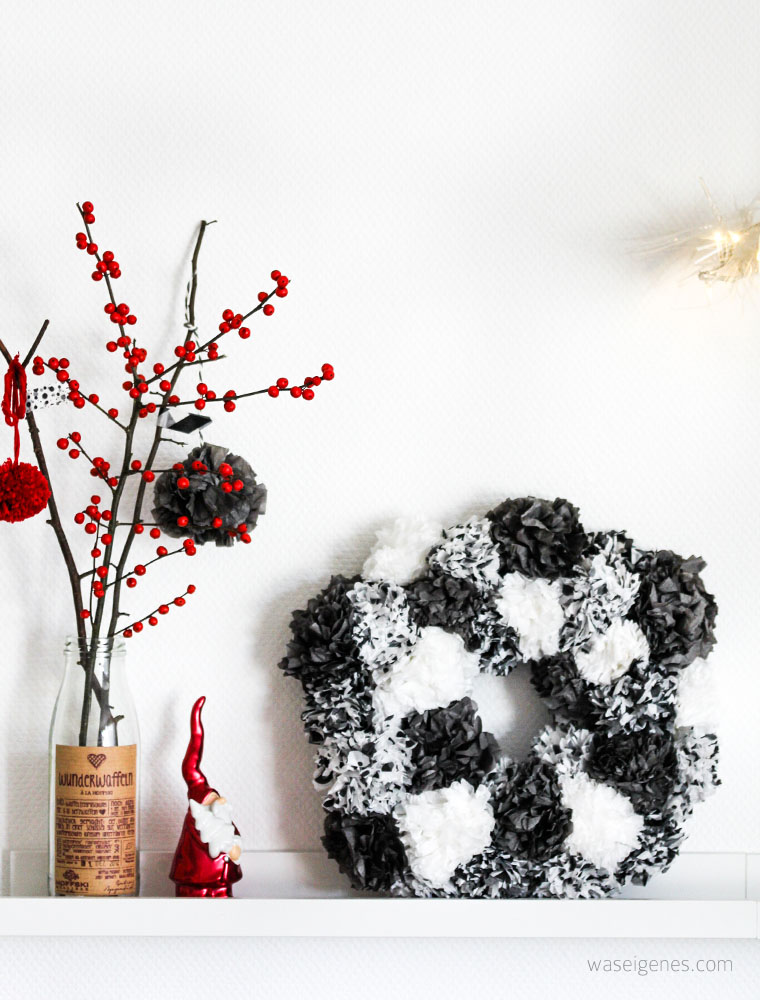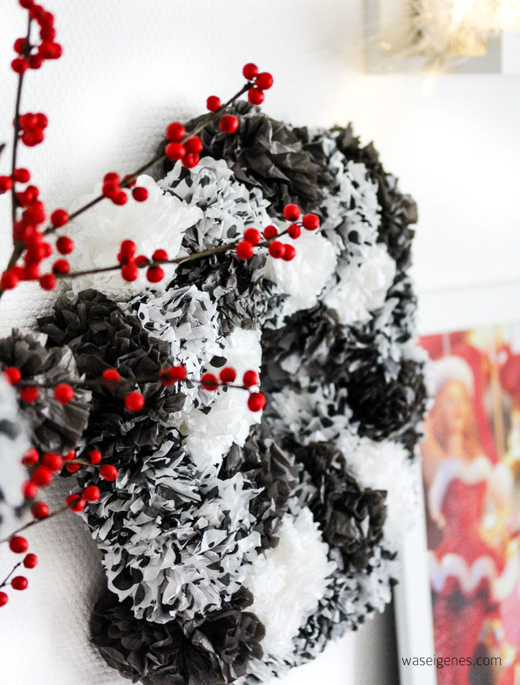 Im Dezember und der Vorweihnachtszeit gehören ins Haus ja eher Rot- und Grüntöne. Gerne hätte ich den Kranz mit rotem und schwarzem Seidenpapier gebastelt, nur leider führt das schwedische Möbelhaus kein rotes Seidenpapier. Liebe Marktingabteilung… könntet Ihr vielleicht diesen meinen Wunsch einmal zu Protokoll nehmen? Das wäre echt nett!