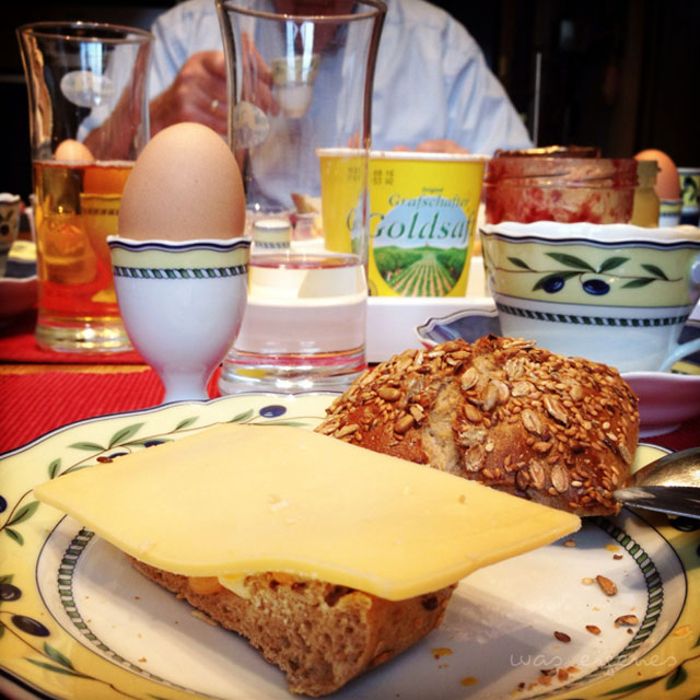 Zum Frühstück nehme ich meinen Platz ein, den ich heftig verteidigen muss, denn wenn die Kinder Urlaub bei Oma und Opa machen, dann ist das Töchterchens Platz. Ich habe aber definitiv die längeren und älteren Rechte darauf. So. Es gibt Kaffee, gekochtes Ei und Körnerbrötchen mit Käse. Sonntagsfrühstück eben.