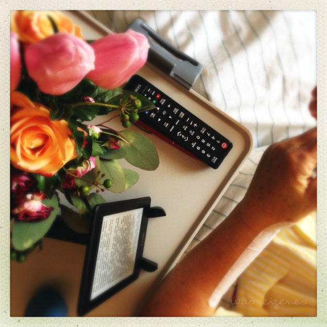 Besuch im Krankenhaus. Meine Mama ist vergangene Woche mit dem Fahrrad schwer gestürzt. Schulter und Unterarm sind gebrochen und zu allem übel noch jeweils auf der einen und anderen Seite. Deswegen freut sie sich über den neuen Kindle-Halter, so kann sie wenigstens lesen.