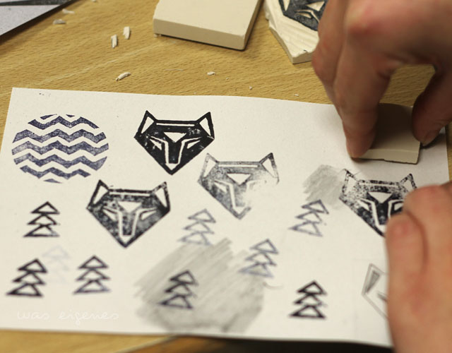 Man benötigt ein Stempelgummi (Printblock), hübsches Papier (Büttenpapier oder blanko Postkarten), Linolwerkzeug, Holzklötzchen und Stempelkissen. Zunächst haben wir alle wie wild mit einem Bleistift unsere Motive gezeichnet oder die mitgebrachten Motive von Kathrin nachgezeichnet. Unsere Zeichnungen haben wir dann auf das Stempelgummi übertragen und danach geschnitzt, was das Zeug hält. Der fertige Stempel wird dann mit doppelseitigem Klebeband auf die Holzklötzchen geklebt. Unser Fazit: Stempel herstellen hat etwas Meditatives, zwischenzeitlich war es im Raum mucksmäuschen still (und das bei 15 anwesenden Frauen!). An dem Abend sind ganz wundervolle Unikate entstanden, viele weihnachtliche Motive, aber auch ganz viele andere tolle Stempel. Es hat mir so großen Spass gemacht, dass ich mir einige Tage später sofort die o.g. Zutaten gekauft und zu Hause weiter geschnitzt habe. Töchterchen war auch gleich Feuer und Flamme und hat kleine Stempel erstellt, mit denen sie das Geschenkpapier ihrer Weihnachtsgeschenke bestempelt hat.