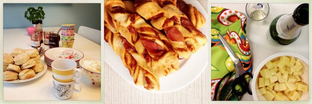 Kaffeeklatsch mit Apfelschorle, Milchkaffee, Scones, einer Freundin und vier Kindern. // Pizzaschnecken nach einem Rezept von Sabrina. Schmecken super und sind ganz leicht zu machen! // Gestern Abend: 26 jecke Wiever (für nicht Kölner: Weiber), 5 Nähmaschinen, Käse-Würfel und Sekt. Nächste Woche wird auf der Mädchensitzung getanz! Alaaf!