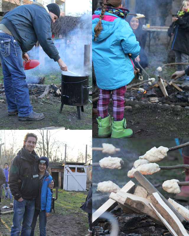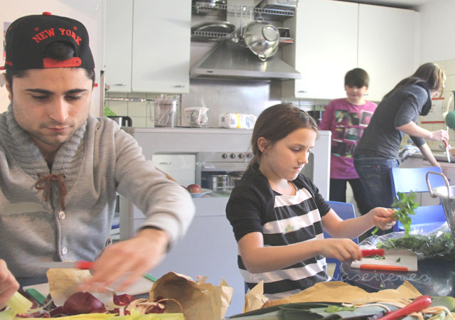 Als alle weiteren Blogger eintrafen gab’s erstmal Kaffee und dann wurden die Aufgaben verteilt. Ich setze mich in die Küche und schnippelte Gemüse für eine Minestrone, die anderen gingen rauss in den Garten und bauten Fußballtore. M., einer der Betreuer machte eine Lagerfeuer, in dem die Kinder später Stockbrot buken. Dazwischen redete ich viel mit Anni und M. und Ben, der von betterplace Berlin für diesen Nachmittag nach Köln angereist war. Ben erklärte mir das Ziel von betterplace, warum sie das alles machen würden und wie wichtig es wäre, dass Spenden zu 100% an die Empfänger weitergeleitet werden müßten und dass man heutzutage solche Aktionen auf den digitalen Bereich erweitern müsse.