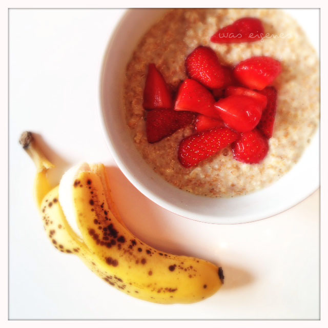 Ich brauche erstmal einen starken Kaffee und ein ordentliches Frühstück, um langsam munter zu werden. Heute auf dem Tisch: Haferflocken mit Erdbeeren, Banane und einem Klecks Honig.