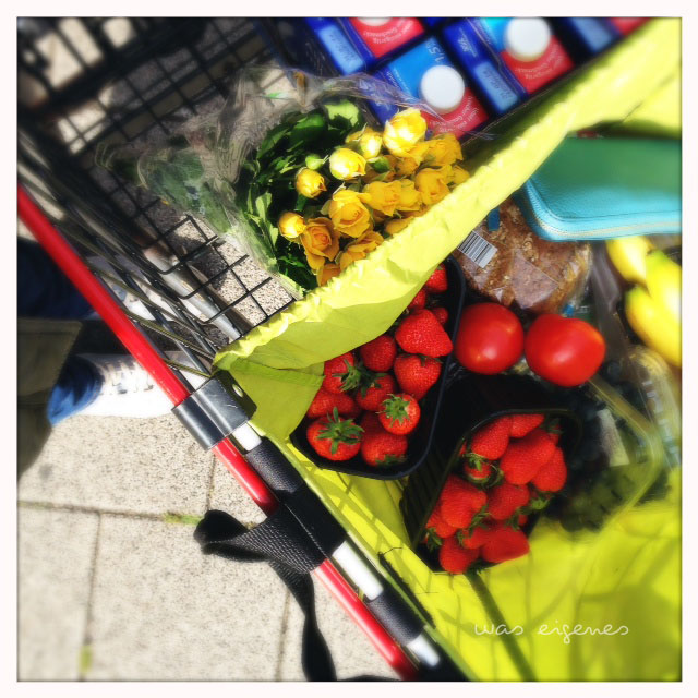 Zum Glück finde ich einen kleinen Schokorest. Zum Kaffeetrinken ist keine Zeit, denn ich habe heute Fahrdienst. Nachdem ich die Mädels am Platz rausgelassen habe, düse ich weiter und kümmere mich das Auffüllen des leeren Kühlschrankes. Mittlerweile gibt es Erdbeeren aus der Region, die richtig lecker sind! Dazu ein bisschen Sonne von oben. Seltsames Wetter!