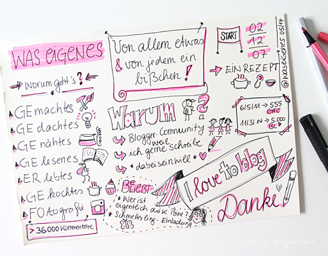 Noch ein PS.: Meine kleine Sketchnote zu meinem Blog habe ich Frau Hölle zu verdanken, die den Kölner Bloggern einen Workshop dazu gegeben hatte. Weitere Inspirationen habe ich mich daraufhin in dem Buch “Sketchnotes” geholt. Tolle Sache!
