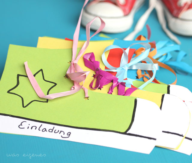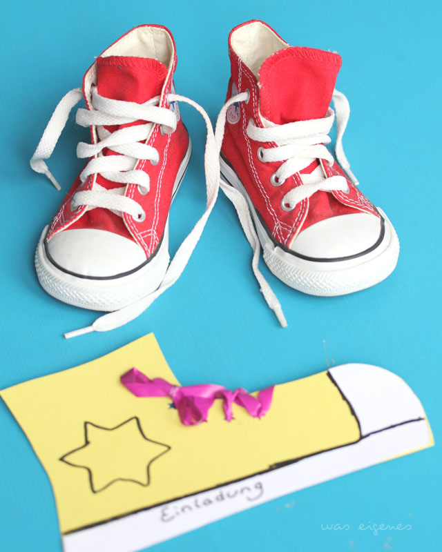 Dass die Einladung ebenfalls wie ein Converse Schuh aussehen sollte, war klar. Ich habe daraufhin einen Schablone gemalt, mit Hilfe dieser das Tochterkind und ihre Freundin die bunten Chucks ausschnitt. Der weisse untere Teil und die Kappe wurden anschliessend auf den bunten Schuh geklebt und mit einem dicken schwarzen Filzstift umrandet. Für Sterne-zeichnen bin ich zu doof, sie werden bei mir immer krumm und schief, deswegen musste hier eine fertige Schablone her halten. Es ist zwar nicht der klassische Chucks-Stern, aber die Damen waren damit einverstanden. Zum Schluss haben wir mit einer kleinen Sternchen-Lochzange Löcher gestanzt und mit Geschenkband die Schnürsenkel durchgezogen und eine Schleife gebunden.