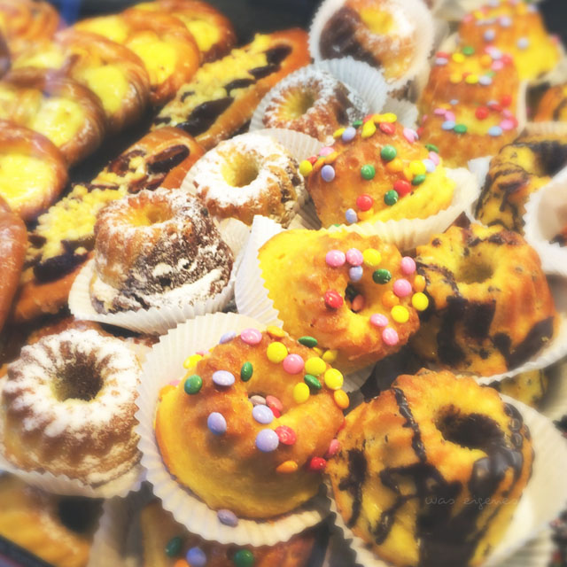 … und Brötchen einkaufen. Die süßen Leckereien sehen zwar appetitlich aus, bleiben aber wo sie sind.
