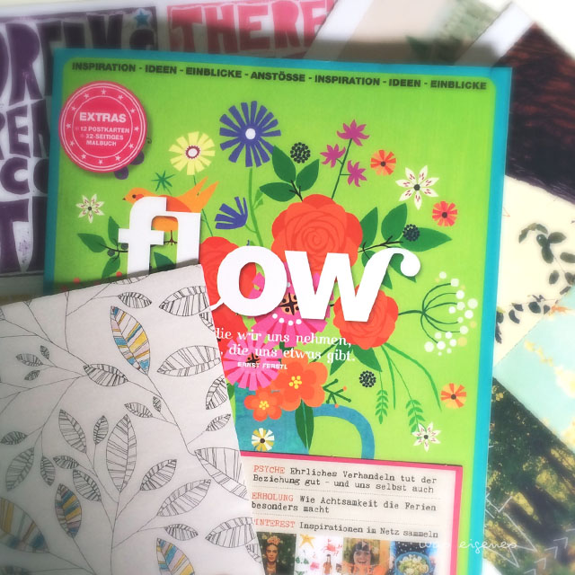 Unsere Postbotin bringt mir die neue Flow, in der wunderschöne Postkarten und ein Malbuch beiliegen. Jetzt stecke ich wieder in der Zwickmühle: Soll ich heute Abend den Roman weiterlesen oder mich der Flow widmen?