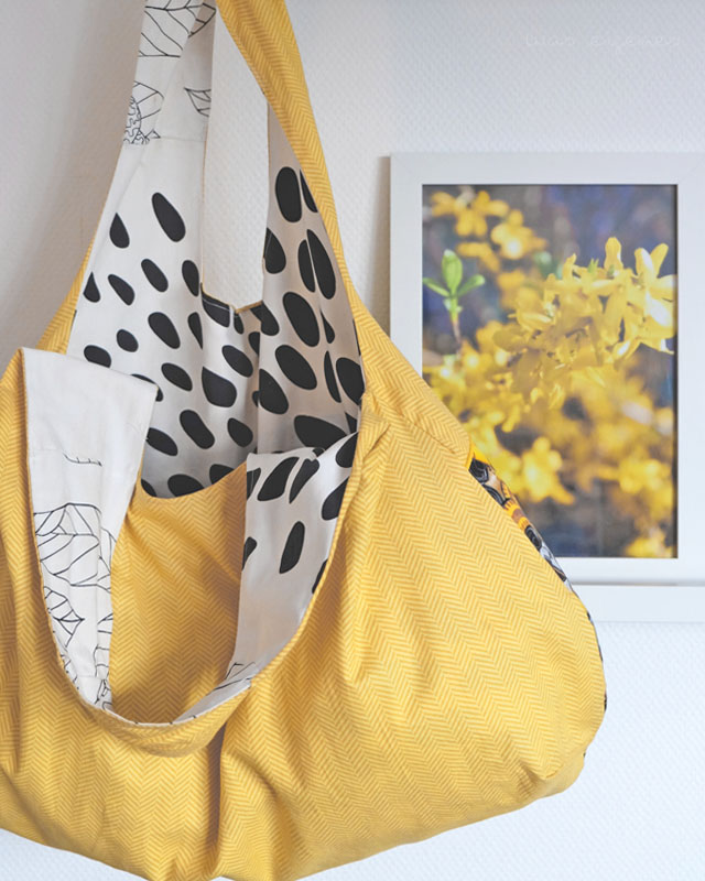 diesen Ikea-Stoff mit den schwarzen Flecken habe ich auch. Und ich will mir schon sooo lange eine hübsche Tasche daraus nähen! Deine gelbe ist aber auch sehr schön geworden, passt perfekt zum Urlaub!