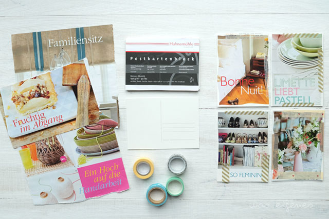 Vorher habe ich aber dann doch noch in die ein oder andere einen Blick geworfen, bin an witzigen Headlines und wundervollen Fotos hängen geblieben und dabei kam mir die Idee: ich bastle daraus Postkarten! Hervorgekramt habe ich blanko Postkarten, die ich schon letztes Jahr, in der Vorweihnachtszeit gekauft hatte, um damit Weihnachtskarten zu bestempeln. Ausserdem einen Klebestift, Washi Tape und eine Schere.