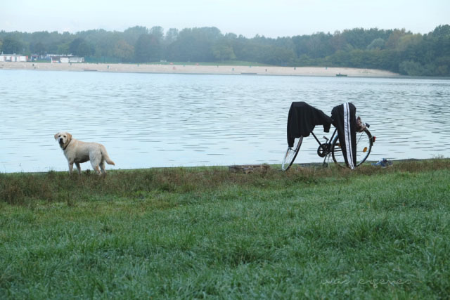 Nachdem Mollie eine Runde geschwommen ist und Stöckchen aus dem See geholt hat, zollen wir einem einsamen Frühsportler Respekt.