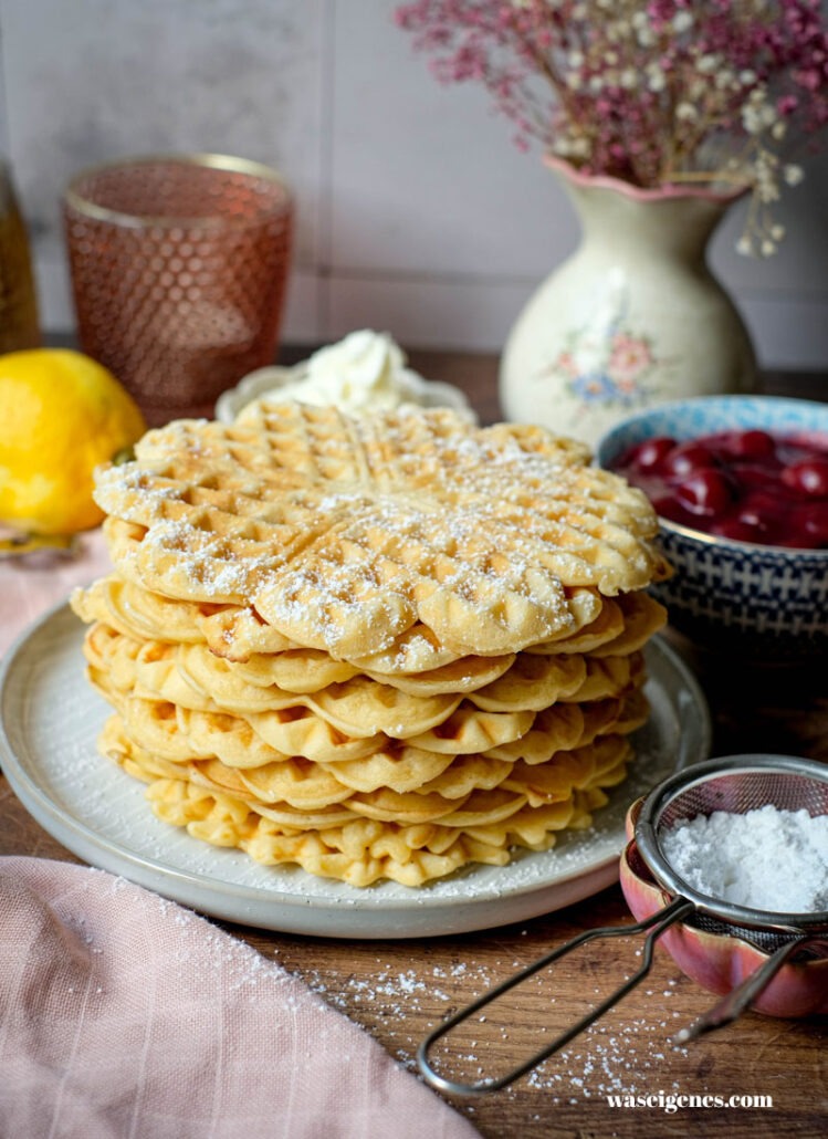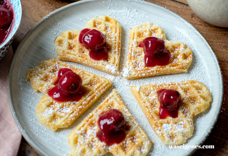 … Ich liebe Waffeln. Mit Puderzucker oder mit allem drum und dran: Schlagsahne und heiße Kirschen. Im Sommer gibt es gerne noch eine Kugel Vanilleeis dazu.