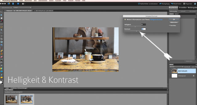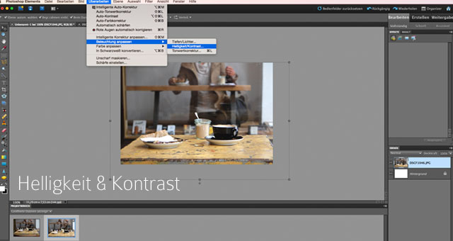 Als nächstes verändere ich den Kontrast. Wieder auf “Überarbeiten” > “Belichtung anpassen” klicken und und dann “Helligkeit & Kontrast” auswählen.