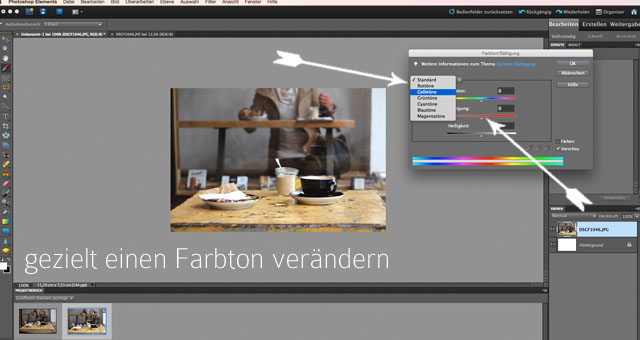 Es öffnet sich wieder ein kleines Fenster. Ihr habt nun die Möglichkeit die Sättigung alle Farben auf einem Schlag zu ändern, oder Ihr klickt einen bestimmten Farbton an, z.B. “Gelb” und erhöht oder verringert nur diesen einen Farbton. Das ist ein wunderbares Tool! Die Farbe “Rot” finde ich oftmals schwierig zu knipsen. habt Ihr schonmal eine Schale Erdbeeren fotografiert und wurdet Ihr erschlagen von diesem über-knalligen Rot? Wenn ja, dann könntet Ihr hier z.B. nur den Rotton etwas reduzieren, die blaue Schale bleibt aber blau.