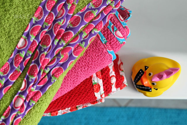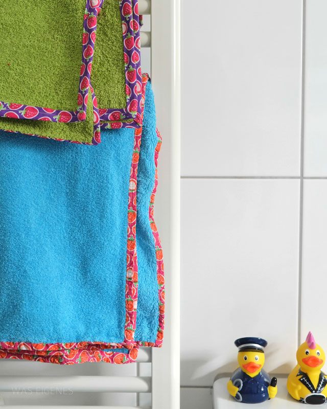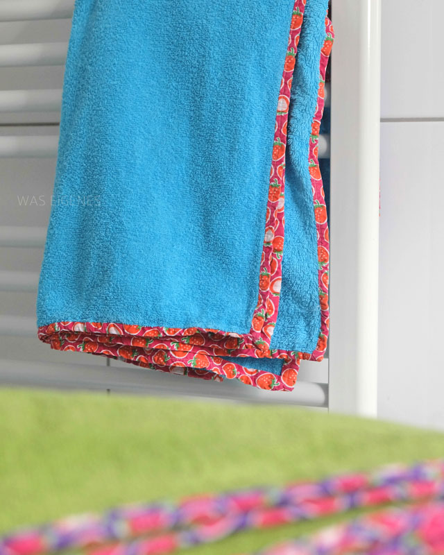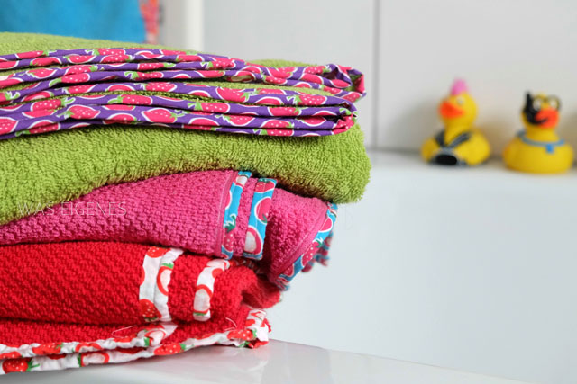 Nun aber zurück zu den Badetüchern. Immer nur Charlies nähen, das macht zwar Spass und ist höchst praktisch, wäre aber vielleicht langweilig. Was ich schon lange auf meinem to-sew-Zettel hatte, war: Badetücher mit hübschen Stoff umnähen. Diese nette Idee plus Anleitung habe ich schon vor einer Ewigkeit bei Frau Draussen nur Kännchen bewundert. Also fuhr ich mit den Kids zu Ikea und kaufte vier bunte Badetücher. An einem Abend waren alle vier Badetücher ummantelt und werden hier seitdem vom Kleinvolk geliebt. Okay, nicht nur vom Kleinvolk. Auch ich ertappe mich immer wieder dabei, dass ich für mich eines der bunten Badetücher aus der Schublade ziehe. ;-)