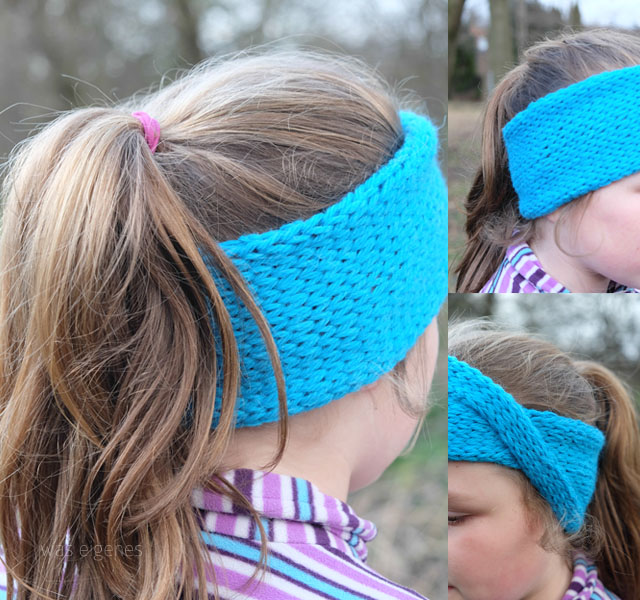 Für mich persönlich sind solche Stirnbänder nichts, weil ich einen Pony trage und nach dem Tragen eines Stirnbandes einfach nur doof aussehe. Aber das Tochterkind war sofort begeistert. Ihr Favorit war das türkisfarbene Band. Die kostenfreie Anleitung dafür gibt es hier. Für Madame habe ich das Band ein wenig schmaler gestrickt, statt 20 habe ich 18 Maschen angeschlagen und es insgesamt etwas kürzer gestrickt, damit es fest am Kopf sitzt.