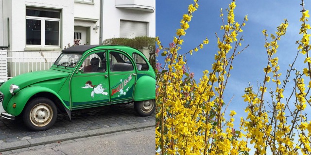 Jetzt aber zu meinem April! {links} Gesehen auf der Eupener Strasse in Köln: eine Sause Ente. Als ich noch klein jung war, wollte ich immer so eine Ente haben und fahren. Meine Eltern schenkten mir stattdessen zum 18. einen Enten-Kettenanhänger. Hübsch, aber nun wirklich nicht die Erfüllung meines Wunsches. Hmpf! Heute bevorzuge ich Autos mit Klimaanlage und Servolenkung. Aber mein Herz hüpft immer noch, wenn ich eine Ente irgendwo sehe! // {rechts} Der Frühling zieht ins Land. Vor unserem Küchenfenster, in Nachbarsgarten knallgelbe Forsythien!