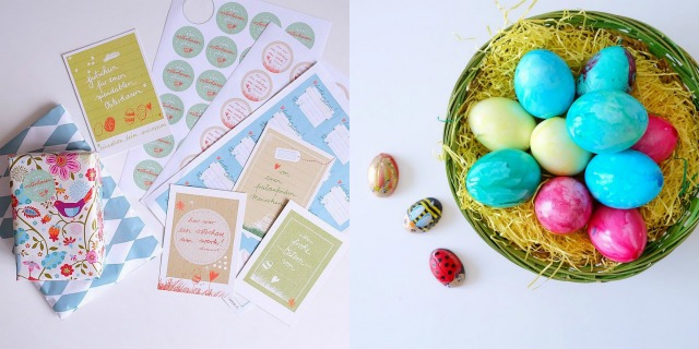 {links} Kleine Ostergeschenke und Aufmerksamkeiten habe ich mit Stickern von Eine der Guten ausgehübscht. // {rechts} Dürfen niemals nie nicht fehlen- selbstbemalte bunte Ostereier und Schokokäfer.