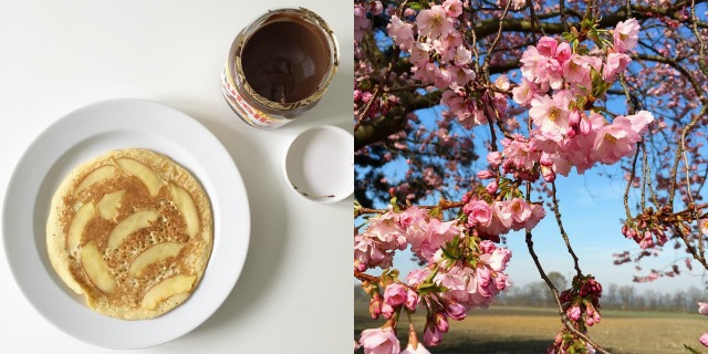 {links} Kinderessen: Apfelpfannkuchen mit Nutella. Der Mann und ich tauchen lieber in Champignon-Cremesuppe ein. // {rechts} Jahaaa…. ich weiß, Blüten, Frühling, trallala!