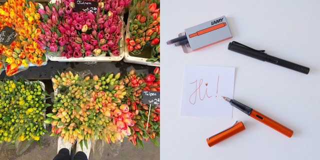 {links} Einmal bitte alle einpacken. Must have zu dieser Jahreszeit: Jede Woche frische Tulpen vom Feld! // {rechts} Vor 20 Jahren habe ich mein Abi mit einem schwarzen Lamyfüller geschrieben (was, wenn ich drüber nachdenke, nicht sein kann! So alt bin ich doch noch gar nicht!). Seht Ihr da hinten die Kauabdrücke meiner Zähne? Damals gab es rote, weisse und schwarze Lamy. Heute gibt es eindeutig fetzigere Farben. Den orangefarbenen Lamy habe ich freundlicherweise einfach so von Lamy zugeschickt bekommen. Lieben DANK!