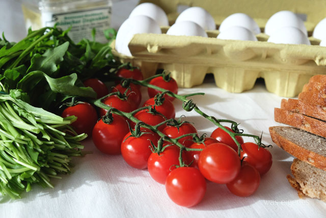 Die Omelett-Muffins habe ich so gemacht: Eine Muffinform einfetten, Tomaten und Rauke in kleine Stückchen schneiden und auf die Muffin-Vertiefungen aufteilen. Eine Hälfte der Muffins bekam noch ein paar Krümel Ziegenfrischkäse mit. Diesen habe ich beim Bauernhof gekauft. Hergestellt wird er in Grefrath am Niederrhein, meine Heimat. In einer Schüssel habe ich dann 8 Eier mit ein wenig Milch aufgeschlagen und mit Salz und Pfeffer gewürzt. Anschliessend habe ich die Eiermasse auf die Muffin-Form verteilt und im Ofen bei ca. 220° 15- 20 Minuten gebacken. Ich habe nicht genau auf die Uhr gesehen… sobald das Ei vollständig gestockt ist, sollte es fertig sein. Dazu gab’s Brot.