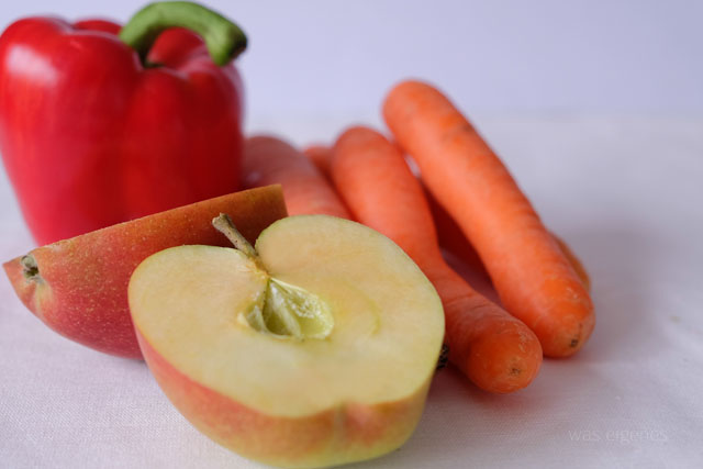 Hinein kommen also Möhren, ein Apfel, eine Paprika und eine Zwiebel. Paprika und Zwiebel haben leider noch keine Saison und können daher nicht aus der Region bezogen werden, aber sie müssen da unbedingt rein! Hier das Rezept: