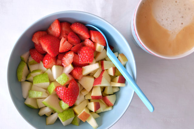 Zum Frühstück gab es eine Schale Obstsalat. Die Äpfel und Birnen kommen von Familie Moog aus Meckenheim, die Erdbeeren zumindest aus Deutschland und der ordentliche Klecks Naturjoghurt vom Milchviehbetrieb Schäfer in Erfstadt-Gymnich. Normalerweise kaufe ich diese großen blauen Becher… Ihr wisst schon, aber in der letzten Woche durfte ein bisschen mehr Fett in den Obstsalat. Der Naturjoghurt hat mir wirklich geschmeckt! Mehr brauche ich morgens eigentlich nicht, um glücklich zu sein. Nein, halt! Kaffee! Kaffee darf auf keinen Fall fehlen. Und hin und wieder kommt noch ein Klecks Honig, den ich übrigens meist beim Imker einen Ort weiter kaufe, dazu.