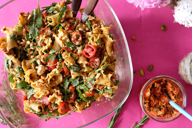 Die beiden Salate bedürfen schon ein wenig mehr Zeit und Vorbereitung. Das Schnippeln und Hacken aller Zutaten (Obst, Salat, Kräuter) dauert. Aber auch hier lohnte sich die Arbeit. Der Italienische Nudelsalat mit selbstgemachter Tomatenpesto sowie der Fruchtige Babyblattspinat mit Nektarinen, Tomaten, Mozzarella und Cashewnüssen haben beide ausgezeichnet geschmeckt. Der Nudelsalat war mir persönlich ein wenig zu mächtig, dafür haben wir den Spinatsalat bis auf das letzte Blatt aufgegessen! Er ist mein absoluter Favorit.