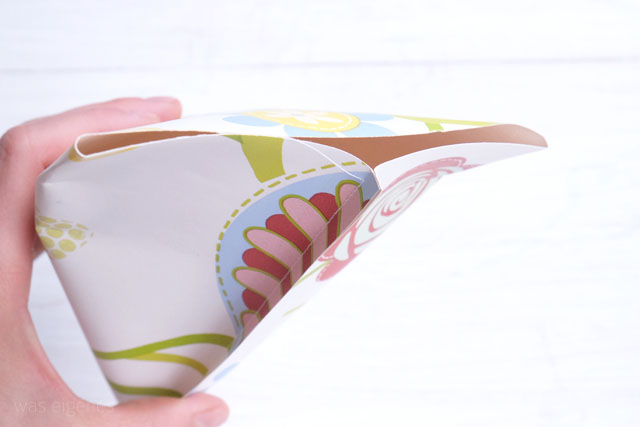 Kleine Aufmerksamkeiten in die Tüte legen und diese dann so falten, dass die Naht der einen Seite auf die Mitte der anderen Seite trifft. Schwer zu erklären- siehe Bild unten. Diese Seite dann ebenfalls mit der Nähmaschine zunähen.