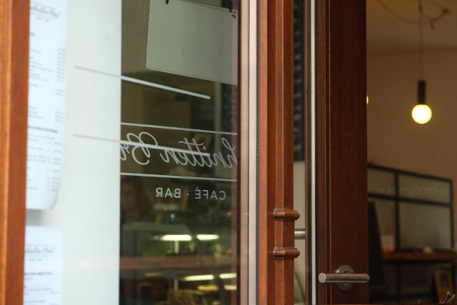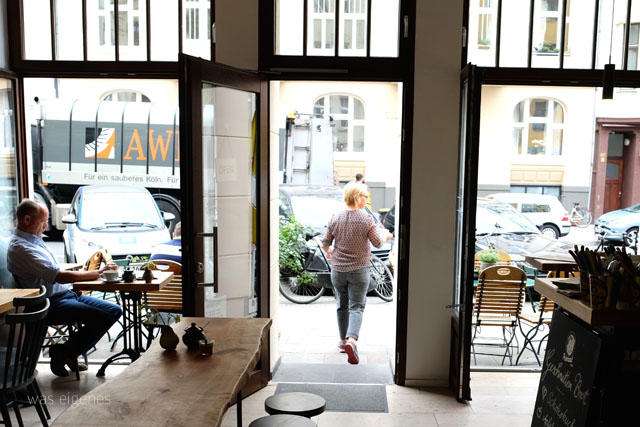 Warum sie keine Croissants und kein Müsli auf der Karte hat?, fragte ich Birgit Winterberg. Na, weil ihr Angebot dann beliebig wäre. Sie bleibt ihrem Konzept treu. Brötchen, Croissants und andere klassische Frühstücksspeisen gibt es überall. Bei Birgit gibt es den ganzen Tag über phantasievoll belegte Brote, mittags wechselnde warme Suppen oder Chili Con Carne und wer dann noch Lust auf was Süßes hat, darf beim selbstgebackenen Kuchen zuschlagen.