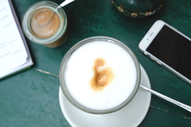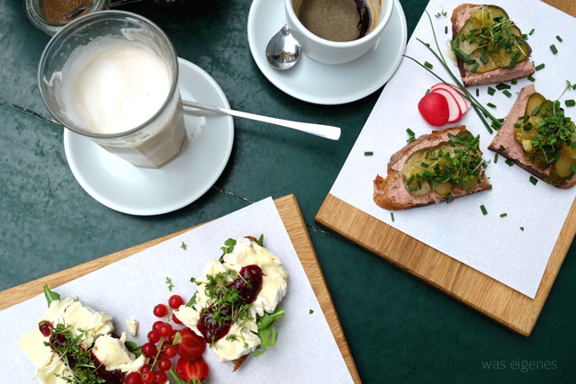 Ich habe mich für die Camembert-Marmeladen-Schnitte entschieden, der Mann für Leberwurst mit Schnittlauchchutney und sauren Gurken. Beides unglaublich lecker! Dazu gab es Latte Macchiatto und frischgepressten O-Saft.