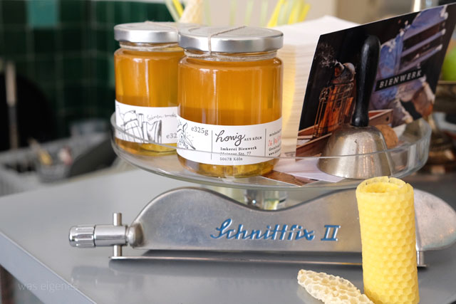Wer gerne Butterbrote isst und keine Lust auf’s Schmieren und Belegen sowie Kräuter hacken und Chutneys kochen, der selbigen hat, dem kann ich Geschnitten Brot wärmstens empfehlen. Danke für die schönen Stunden und das nette Gespräch in deinem Café, Birgit! Und wer gerne Honig isst: Bei Geschnitten Brot kannst Du ein oder zwei oder drei Gläser Bienwerk kaufen. Der Honig ist ein echt kölsches Erzeugnis vom Hobbyimker Frank Miethen.