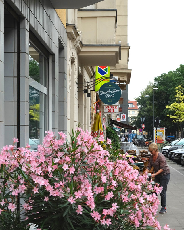 In ihrem früheren Leben hat sie irgendwas mit Medien gemacht. Heute betreibt sie ihr eigenes Café mit der Lotto-Annahmestelle im hinteren Bereich. Bei schönem Wetter saßen wir auf dem Bürgersteig vor dem Bistro und schauten Menschen beim Gehen über die Alteburger Strasse und dem Müllmännern beim Arbeiten zu.