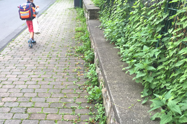 Mollie muss nochmal raus. Gleich vor der Türe: Kinderkunst und erste Herbstboten. Dabei haben wir 28° Grad. Viel zu warm für lange Hosen!