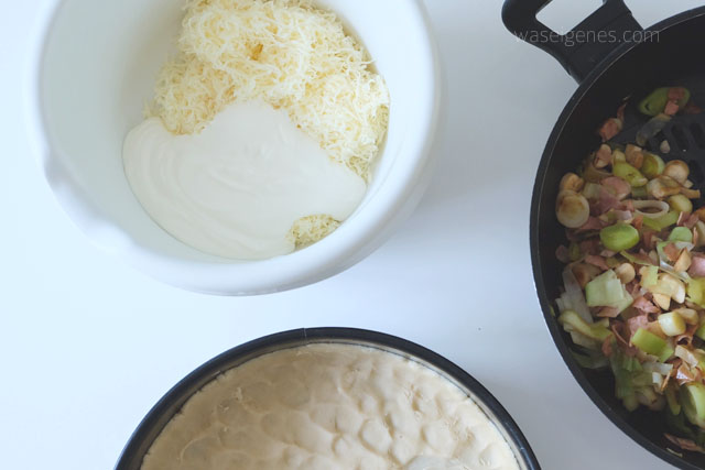 Heute Abend gehen wir essen. Ich koche schonmal für morgen. Quiche mit Lauch, Champignons und Schinken.