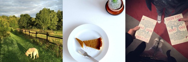 Herbstlicht und Herbsthimmel. Die morgendlichen Spaziergänge sind entweder ein Graus, weil Regen von oben und matschige Wege von unten oder nur traumhaft schön! | Schmeckt nicht und sie nicht mal gut aus. #fürmehrRealitätaufInstagram! :-) Dieser Kürbispie is’ nix. Muss auch mal gesagt werden. | Zusammen mit Sarah besuche ich eine Lesung von Usch Kollritsch und Stephanie Jana in der Mayerschen in Nippes. Die beiden lesen aus ihrem Buch “Das Jahr des Rehs” – ein so schöner Roman. In der Pause lerne ich die beiden persönlich kennen und freue mich, dass sie schon an einem neuen Roman schreiben!