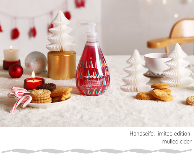 method: Es ist vier Uhr Nachmittags. Kannst du dich daran erinnern, wo Deine Hände überall waren? Nein? Dann solltest Du sie schleunigst waschen. Am besten mit dieser himmlisch duftenden Handseife. Und dann ein sauberes High-five mit duften Händen! Flasche aus 100% recyceltem Plastik (= gutes Karma), ohne Parabene, vegan weil pflanzenbasiert. Die Limited Edition Handseife Mulled Cider duftet nach Apfel, Zimt + Nelke und weckt dabei Erinnerungen an feucht-fröhliche Weihnachtsmärkte, gebrannte Mandeln + Bratäpfel; ab dem 15. November ist sie exklusiv bei BigGreenSmile erhältlich.