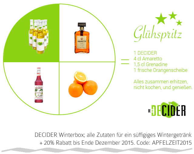 DECIDER: Gönne Dir eine Auszeit und genieße den fruchtig-herben Geschmack unseres Ciders, der nicht nur gut schmeckt, sondern auch gut tut. Für unseren DECIDER verwenden wir Äpfel von deutschen Streuobstwiesen. Produziert wird er in einer Kelterei in Hessen. Der DECIDER enthält weder Zucker (nur Rest-Apfelfruchtzucker) noch andere künstliche Zusatzstoffe. So erhalten wir ein hochwertiges, natürliches Getränk, mit vergleichsweise wenig Kalorien bei vollem Geschmack. Unsere Winterbox enthält alle Zutaten für den DECIDER-Glühspritz, einer süffig-leckeren Alternative zu herkömmlichem Glühwein.