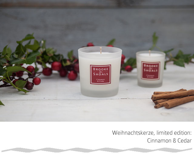 Brooke & Shoals: Gerade mit schönen Momenten verbinden wir in unseren Erinnerungen oft mehrere Sinneseindrücke. Vor allen Dingen Gerüche rufen die jeweiligen Eindrücke aber wieder in unser Gedächtnis. Die nur saisonal erhältliche, limitierte Cinnamon & Cedar – Variante schafft es die Weihnachtstage noch schöner zu machen und sie zu konservieren: Indem mit jedem Anzünden, Zimt- und Zederaromen an die Festtage erinnern.