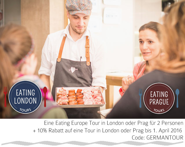 Eating Europe: In einer vierstündigen Tour geht es auf eine einzigartige authentisch-kulinarische Entdeckungsreise auf einheimische Märkte, in Bäckereien, Geschäfte, Restaurants und Cafés, lernt Bewohner der Viertel kennen, bekommt einen völlig neuen Einblick in Kultur und Geschichte der jeweiligen Stadt und geniesst dabei Proben von landestypisches Gerichten und Spezialitäten. Ihr habt die Wahl zwischen einer Tour in London oder in Prag.