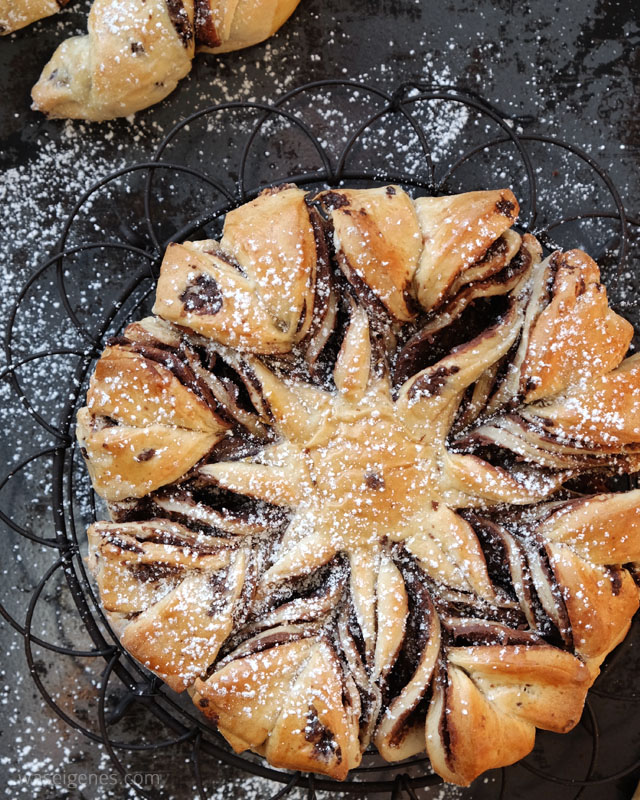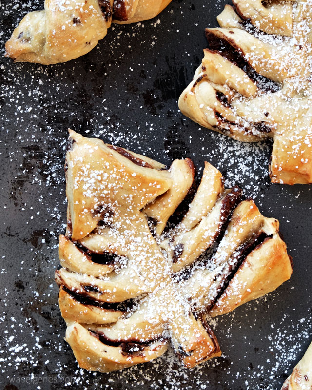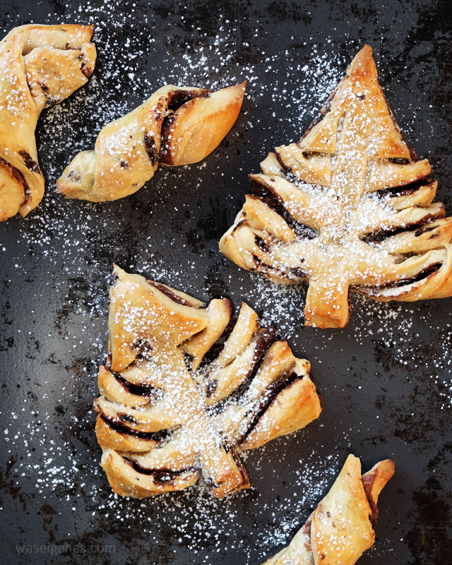 … also, nochmal von vorne: Einmal im Knotenwahn, backte ich gleich noch ein paar Weihnachtsbäumchen hinterher. Die schmecken genauso lecker, sehen auf einer weihnachtlichen Kaffeetafel aber noch hübscher aus. Die Zutatenliste ist kurz! Alles, was Ihr benötigt ist Brioche Fertigteig, Nutella und vielleicht ein bisschen Puderzucker.