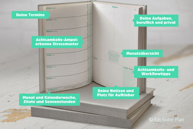 Deswegen möchte ich heute einen guten Plan weitergeben. An jemanden, der gern plant, schöne Bücher liebt und dem es nicht nur um das Planen der Termine, sondern auch um das persönliche Wohlbefinden geht. Der gute Plan ist Terminkalender, Lebensplaner und Sachbuch in einem. Milena und Jan sagen: “Übersichtlich und mit viel Platz für deine To-Dos. […] Wenn du nur deinen Alltag planst kommst du nicht weiter. Ein guter Plan hilft dir Ziele zu definieren und Ideen zu verwirklichen. Wusstest du, dass Ideen 80% wahrscheinlicher umgesetzt werden, wenn man sie mit Stift auf Papier schreibt? […] Zahlreiche renommierte Gastautoren aus Kultur und Glücksforschung erweitern deinen Horizont. Du lernst viel über Achtsamkeit, individuelles Glück, guten und schlechten Stress und Workflow-Optimierung, damit du Chaos im Kopf vermeidest.” Die beiden haben den guten Plan durch Crowdfunding finanziert.