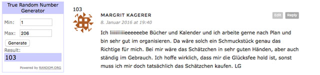 Edit, Montag, den 11. Januar 2016: Die Gewinnerin steht fest! Herzlichen Glückwunsch, Margit!