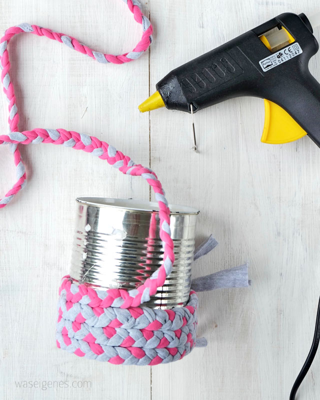 Dann habe ich die gute alte Heißklebepistole zur Hand genommen, die geflochtenen Streiften um die Konservendose geklebt und mir dabei ordentlich den Zeigefinger verbrannt. Immer das gleiche…. Die Anfänge und Enden der Streifen habe ich verknotet, knapp abgeschnitten und überklebt.