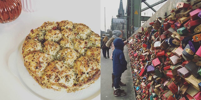 links Nach dem Rezept von Mara und der Ursprungsidee von Steph backe ich ein Käse-Kräuter-Brot. Das ist richtig lecker. Ich hätte nur die Teigkugeln etwas kleiner machen sollen. rechts Ausflug nach Köln. Erst bummeln wir zur Hohenzollern- aka Liebesschlösserbrücke….