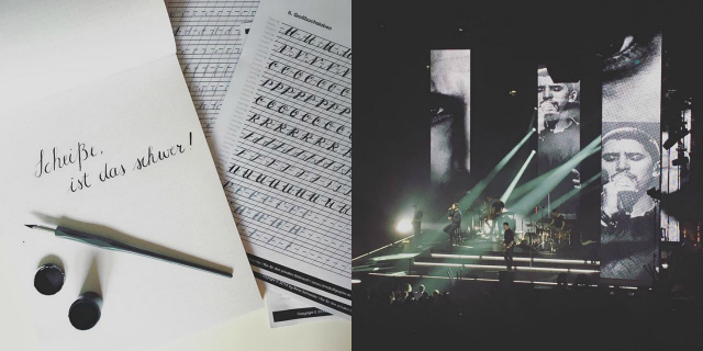 links Gar nicht so einfach. Ich übe Schönschrift mit Feder und Tinte nach einem Tutorial von Anna. rechts Hey! Astronaut. Ultraleicht. Wieder am leben. Auf anderen Wegen. Nur in meinem Kopf. Zusammen untergegangen. Auf uns! Super tolles Konzert, super cooler Typ!