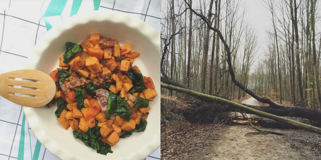 links Süßkartoffelpfanne mit Zwiebeln, Tomaten, Paprika, Speck und frischem Spinat. Sehr lecker! rechts Kurzfristige Sperrung. Das Unwetter an Karneval hinterläßt Spuren!