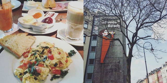 links Ich kann ja zu jeder Tageszeit frühstücken. Hier im Balthasar auf der Aachener Strasse! rechts Kölner Wahrzeichen? Na auf jeden Fall der Dom. Und das Reissdorf Männchen. Das fand ich schon als Kind toll. Wie gut, dass es unter Denkmalschutz steht!